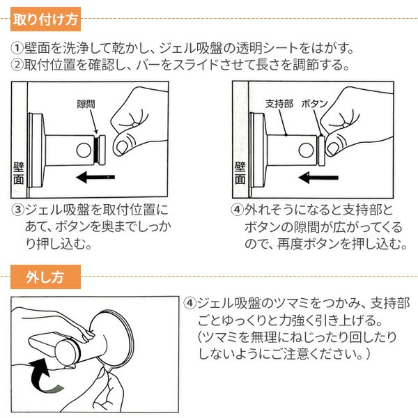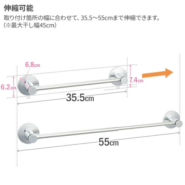 掛架採用18-8不鏽鋼管製造,耐用防鏽,適合浴室或廚房潮濕環境。最大特色是「凝膠吸盤」設計,能牢固吸附於一般吸盤難以固定的粗糙面或磨砂玻璃,安裝簡單,只需按壓即可固定,亦可重新按壓恢復吸力,避免掉落。掛桿可伸縮調整,長度約35.5至55cm,最大掛幅約45cm,承重可達2kg,足以掛毛巾、抹布或小型衣物👍🏻