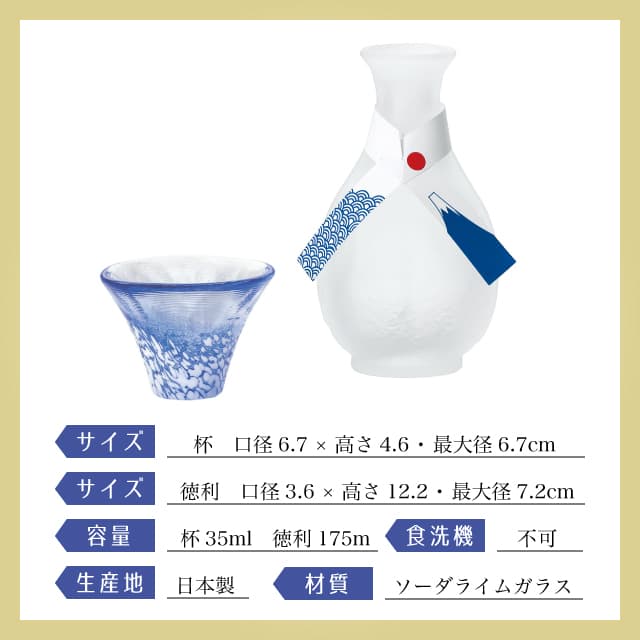 以日本象徵 富士山 為設計靈感,酒杯底部呈現富士山造型,搭配透明與藍色漸層玻璃,視覺效果清澈優雅。套裝包含一個冷酒清酒壺(容量約175ml)及一個酒杯(容量約35ml),適合冷酒或清酒使用。玻璃材質採用高品質無鉛玻璃,手工製作,光澤細膩,兼具美觀與實用👍🏻