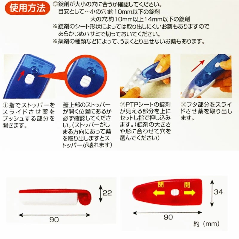 🔥🔥【日本製《石丸合成樹脂》便攜藥丸取出器】 🇯🇵🇯🇵日本製造🇯🇵🇯🇵 大小雙孔設計,能對應不同尺寸的藥丸,使用時只需將藥片鋁箔包放置於孔位並輕輕按壓,即可順利將藥片推出,避免因指力不足或包裝堅硬而造成困難。產品採用滑動式鎖扣設計,攜帶時更安全,不會因意外壓力而導致藥片掉落。小巧的口袋尺寸方便隨身攜帶,適合長者、兒童或需要經常服藥的人士使用。取出的藥丸會集中於下方收納區,能清楚分辨是否有鋁箔碎片混入,減少誤食風險,設計貼心且實用👍🏻 使用方法: 將藥丸鋁箔包放置於取出孔位,對準藥片位置後輕壓,即可將藥丸推出並落入下方收納區。使用後可將藥片取出服用,並清理殘留的鋁箔碎片。建議保持器具清潔,避免藥丸受污染。 材質:樹脂 / 聚丙烯(PP) 尺寸:約 34 × 90 × 22 mm 重量:約 23 g 產地:日本 💢如沒註明【現貨】訂貨需時約3-4星期 ___________________________________________ 💬 唔想錯過最新產品資訊及優惠歡迎加入我哋Whatsapp群組: https://chat.whatsapp.com/IJFfq1i7kMz46Zjc1NSXQF ___________________________________________