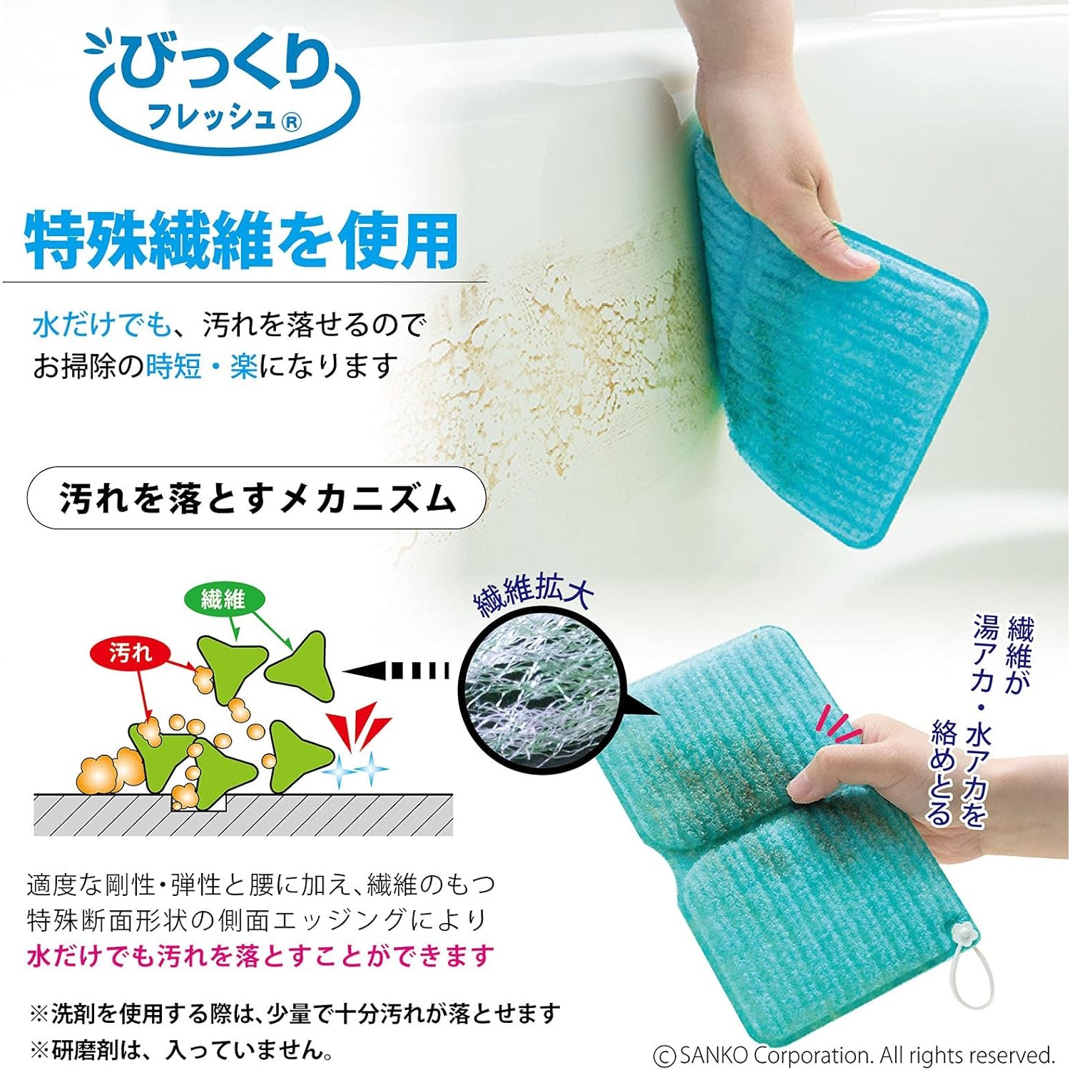 採用特殊纖維設計,只需清水即可有效去除浴缸、瓷磚及洗手盆上的水垢與皂垢,無需依賴化學清潔劑,既環保又安全。纖維表面經過精細加工,能在不刮傷表面的情況下快速清潔👍🏻