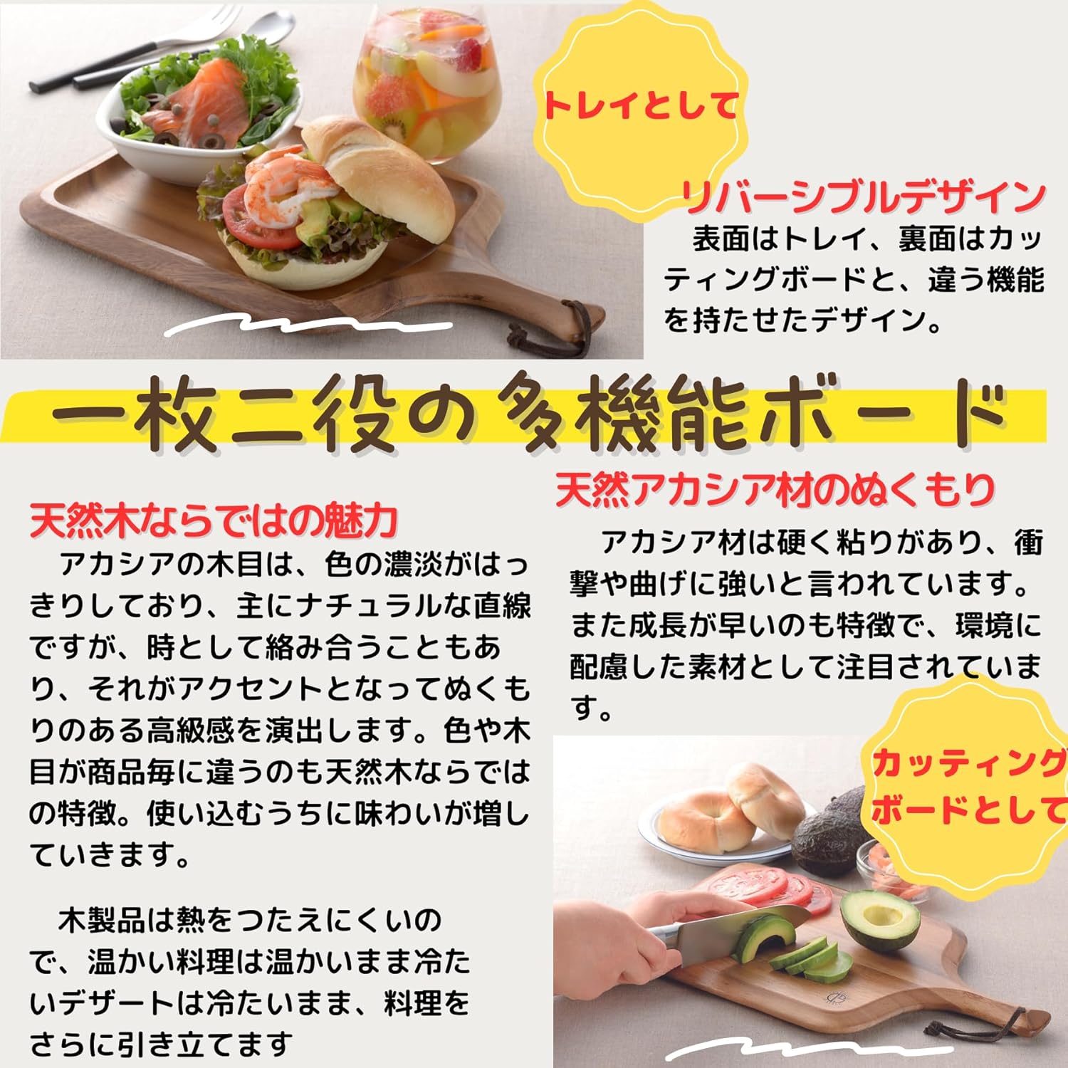 以北歐設計為靈感,選用天然相思木製作,木紋獨特,質感溫潤。表面可作為砧板使用,適合切割麵包、水果或日常食材;背面則可作為托盤,方便盛載糕點或餐食,兼具實用與美感。尺寸適合家庭餐桌,厚度適中,耐用且不易變形,能為餐桌增添自然氛圍👍🏻