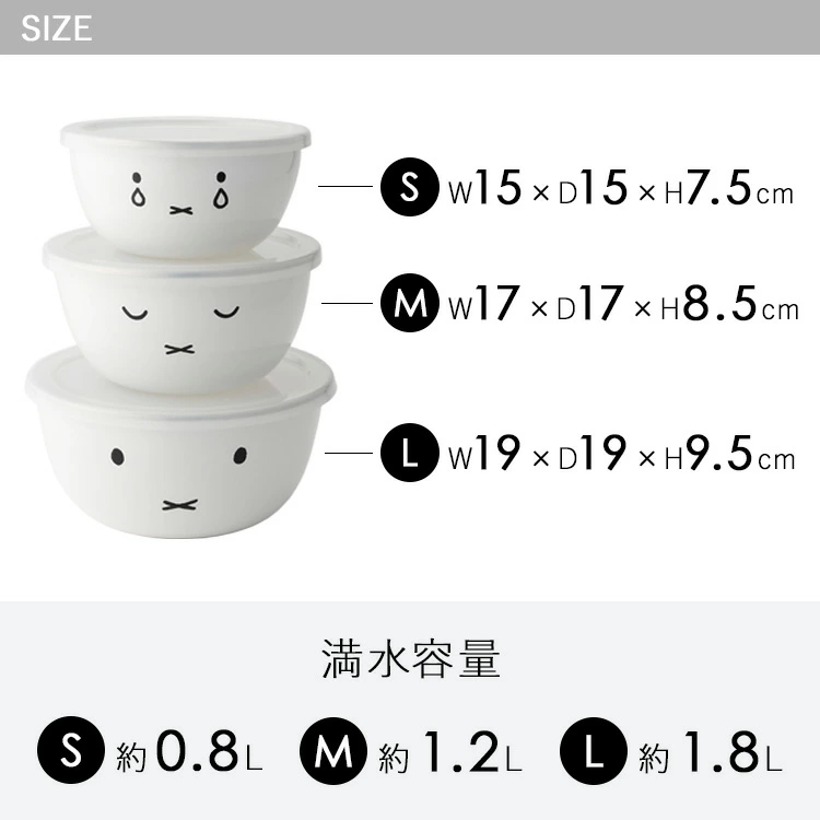 🔥🔥【日本直送《MIFFY x FUJIHORO》琺瑯食物盒三件套】圓形 採用高品質琺瑯鋼板製造,外層以純白釉面搭配米菲臉部設計,簡潔可愛。套裝包含三個不同尺寸:14cm、16cm、18cm,容量分別約0.8L、1.2L、1.8L,重量輕巧,適合料理前的食材準備、混合麵糊或沙律。琺瑯材質耐酸耐鹽,能防止食材氣味殘留,並具備優良耐熱與冷卻性能,可直接放入冷凍庫保存,亦可用於烤箱作為料理器皿。碗身可堆疊收納,節省空間,設計兼具美觀與實用👍🏻 14cm 尺寸:大約 W15 x H7.5 x D15 cm / 0.8L / 255g 16cm 尺寸:大約 W17 x H8.5 x D17 cm / 1.2L / 336g 18cm 尺寸:大約 W19 x H9.5 x D19 c​​m / 1.8L / 428g 📌使用方法 - 🥗 料理準備:適合混合沙律、麵糊或醬汁。 - 🍮 烤箱料理:可作為焗烤或烘焙容器使用(僅限本體)。 - ❄️ 冷凍保存:可直接放入冷凍庫保存食材。 - 🧼 清潔方式:使用柔軟海綿清洗,避免刮傷琺瑯表面 材質:琺瑯鋼板(本體)、聚乙烯(蓋) 產地:泰國(日本品質監控) 💢如沒註明【現貨】訂貨需時約3-4星期 ___________________________________________ 💬 唔想錯過最新產品資訊及優惠歡迎加入我哋Whatsapp群組: https://chat.whatsapp.com/IJFfq1i7kMz46Zjc1NSXQF ___________________________________________