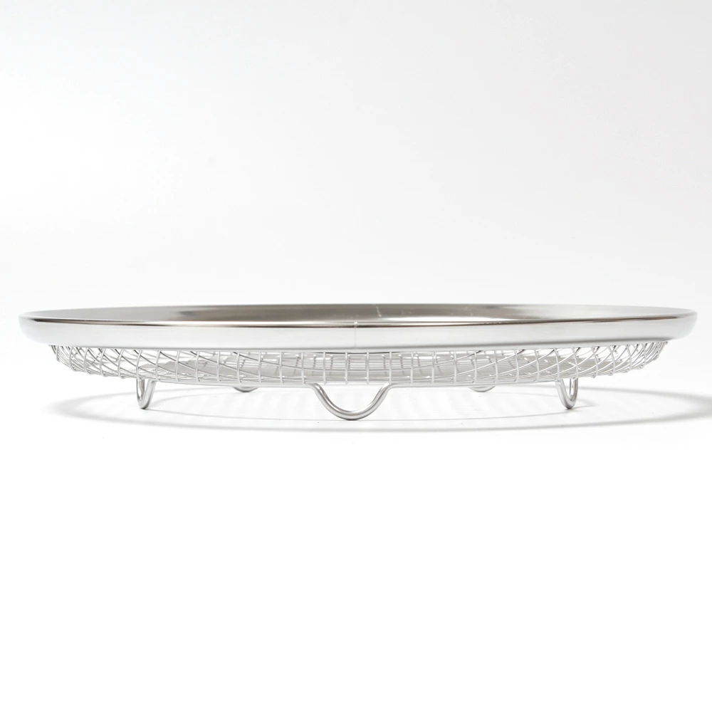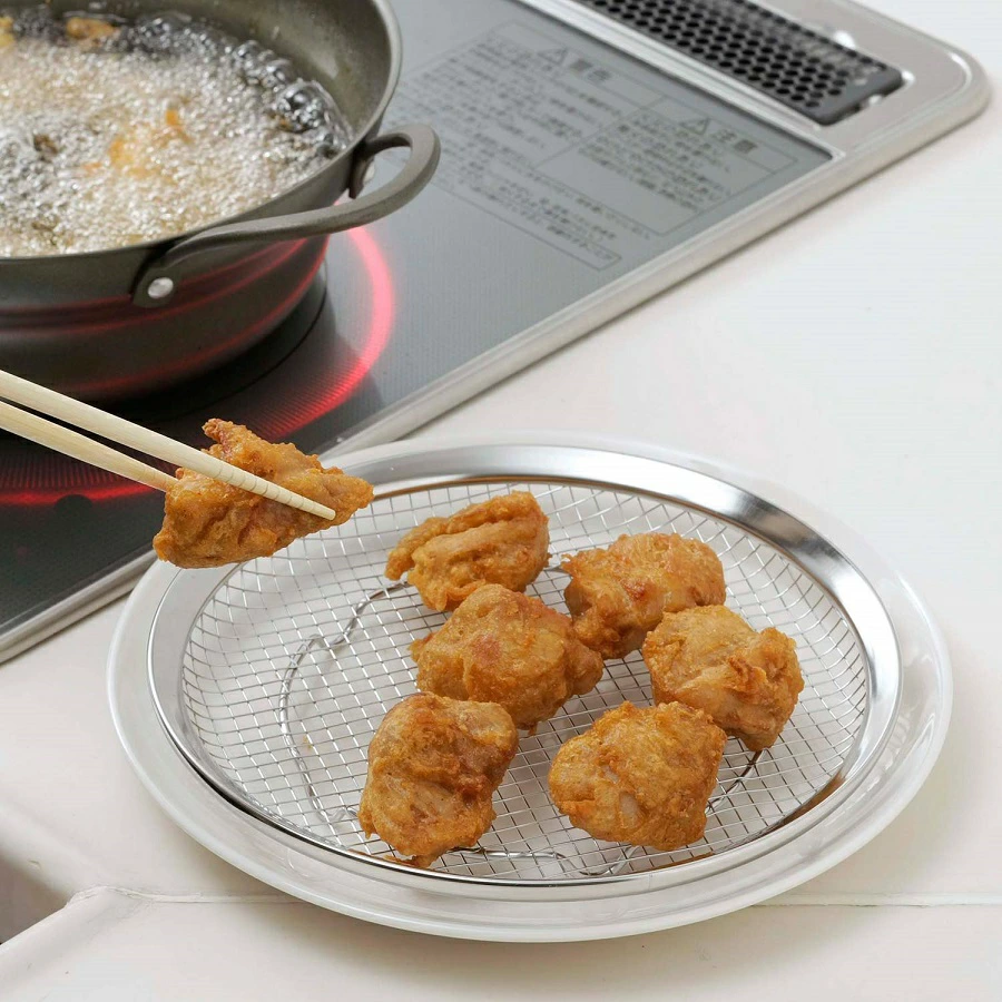 採用 18-8 不鏽鋼製成,堅固耐用且易於清潔。設計重點在於利用金屬網架與平皿之間的空間,讓炸物或烤物的多餘油分自然滴落,保持食材乾爽,延長香脆口感。除了炸雞、天婦羅等油炸食品外,亦可用於水煮枝豆或蔬菜的瀝水,甚至放置剛烤好的吐司,保持外層酥脆。網架附有小腳設計,能穩固放置於平皿上,直接端上餐桌亦美觀實用👍🏻
