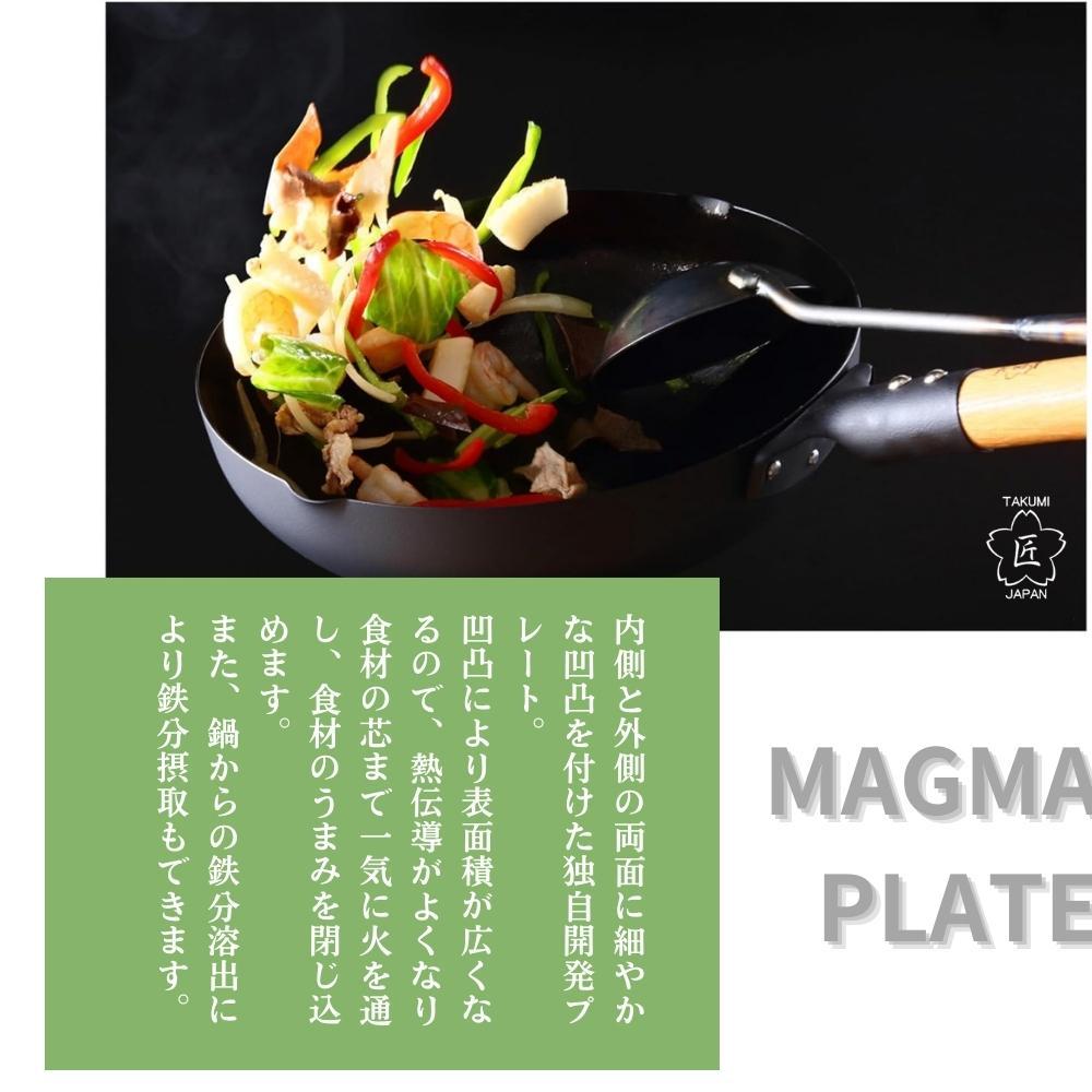 這款鐵製炒鍋採用了獨家開發的「Magma Plate 火山岩紋導熱板」,鍋身內外皆經特殊凹凸處理,大幅提升表面積,使熱能能夠更快速且均勻地傳導至食材深處,牢牢鎖住食材的鮮味與香氣。這種凹凸紋理不僅提升導熱效率,也因接觸面積減少而降低食材焦黏的可能性,讓炒菜過程更順手、成品更美味。無論是高溫爆炒或細火慢煎,都能展現職人級的料理效果,是講究火候與風味的料理者不可或缺的好鍋。