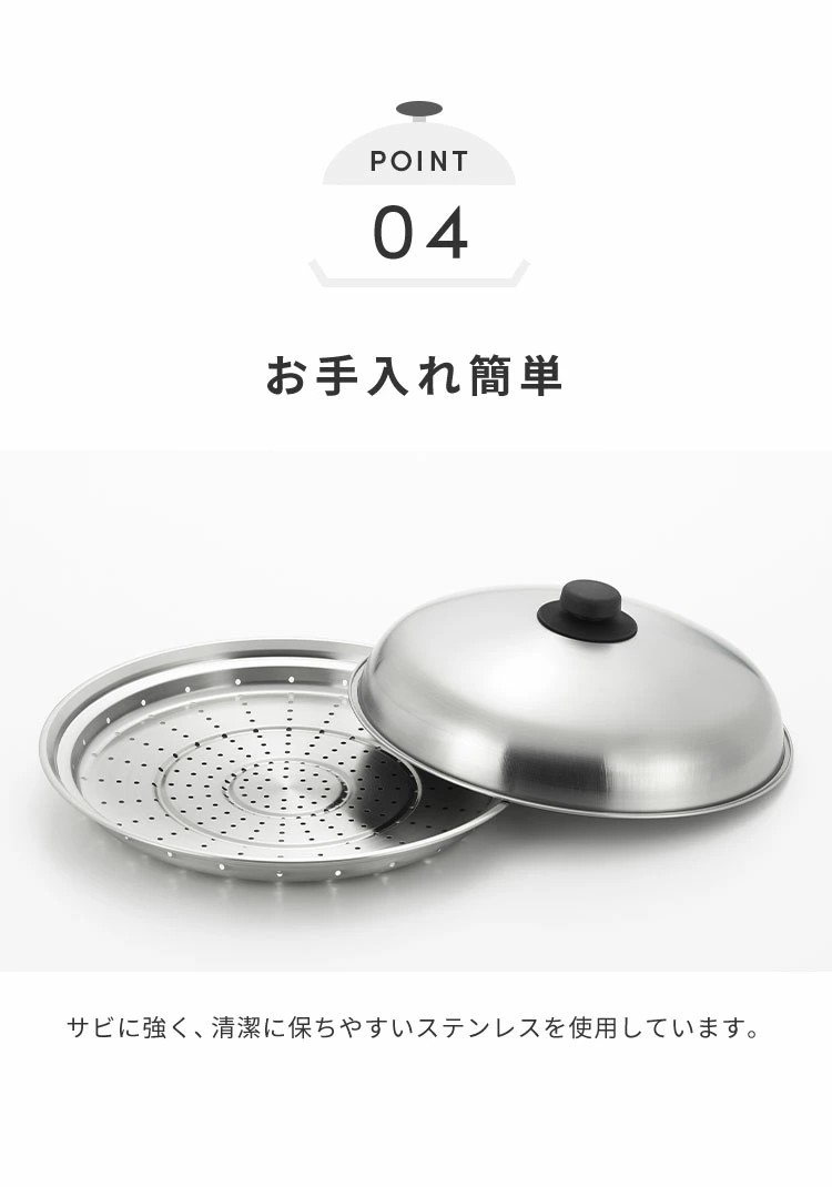 採用高品質不鏽鋼材質,設計可直接放置於28~30cm的平底鍋上使用,瞬間將普通鍋具變成蒸鍋。配備專用不鏽鋼蓋,能保持蒸氣循環,令食材均勻受熱。此蒸煮盤適合多種料理,包括蒸蔬菜、蒸魚、蒸餃子、中華包子或蒸燒賣,能保留食材原味與營養,烹調更健康。結構簡潔,清潔方便,適合家庭日常使用👍🏻