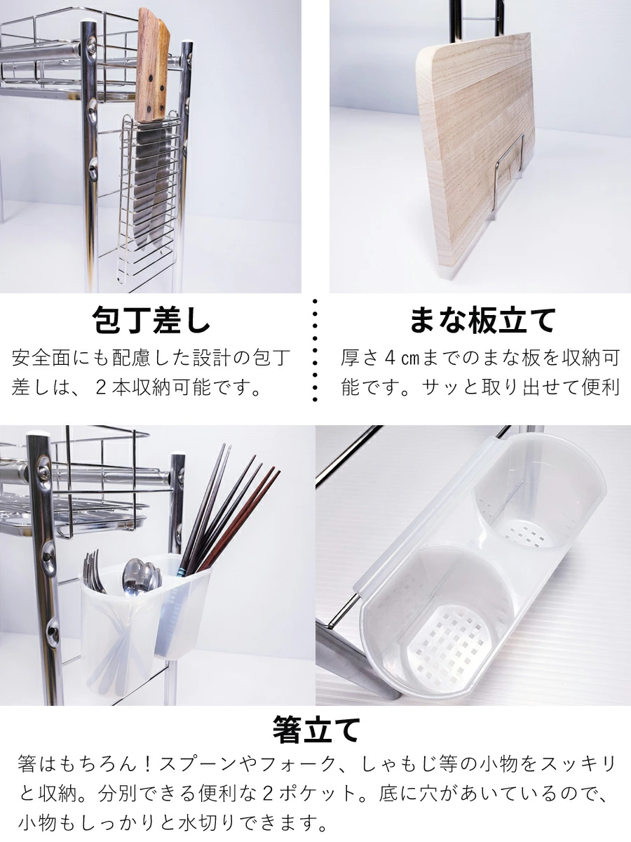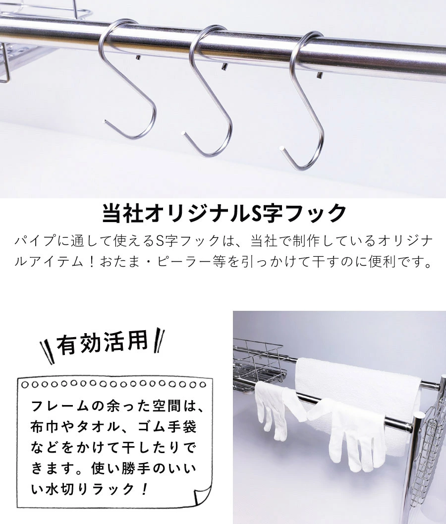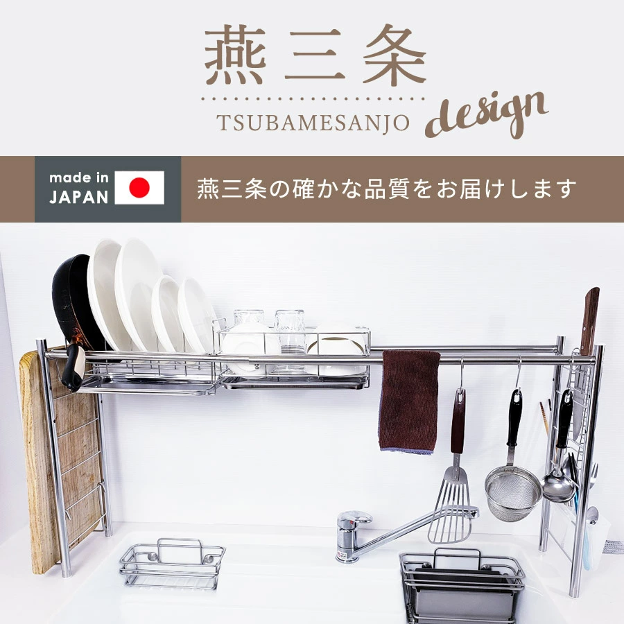 採用全不鏽鋼材質製造,完全不使用容易劣化的塑膠連結部件,堅固耐用且設計簡潔。尺寸可伸縮,寬度約60~104cm、深度約19cm、高度約46cm,適合不同大小的水槽使用。重量輕巧,耐荷重約2kg,能穩固放置碗碟、玻璃杯及砧板。此水切架能有效利用水槽上方空間,增加檯面工作區域,特別適合一人或兩人居住的小型廚房。日本燕三条製造,品質可靠,設計注重耐用性與衛生,能長期使用而不易生鏽。👍🏻