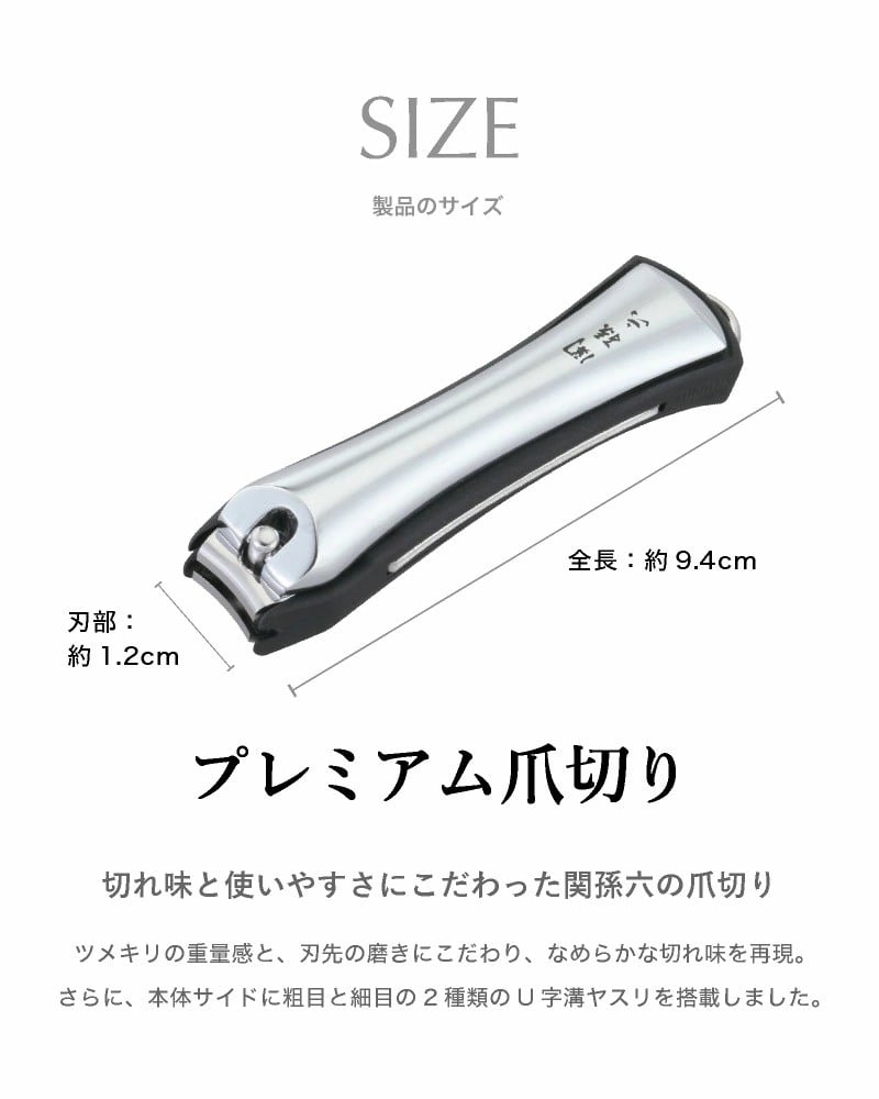 🔥🔥【日本製《關孫六》不鏽鋼指甲鉗】 🇯🇵🇯🇵日本製造🇯🇵🇯🇵 這款指甲剪源自劍匠傳統,刃部採用不鏽鋼刃物鋼製作,確保鋒利及耐用。配備粗目及細目雙向U型溝銼,方便修整指甲邊緣,避免邊角粗糙。設有止動器,防止剪屑飛散,保持清潔。槓桿為鋅合金鍍鉻設計,握持穩定不易滑手,整體結構堅固,適合日常手足指甲保養👍🏻 材質:不鏽鋼刃物鋼、鋅合金(鍍鉻)、彈性體樹脂、銼刀為不鏽鋼 尺寸:94×23×19毫米 容量:67g 產地:日本 🇯🇵日本直送約3-4星期 ___________________________________________ 💬 唔想錯過最新產品資訊及優惠歡迎加入我哋Whatsapp群組: https://chat.whatsapp.com/IJFfq1i7kMz46Zjc1NSXQF ___________________________________________