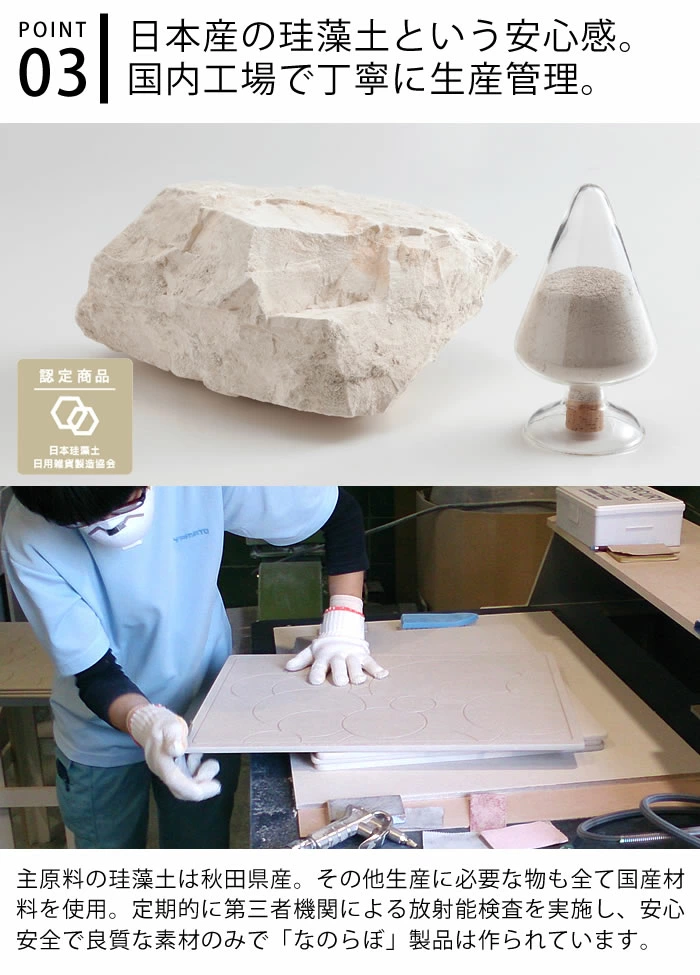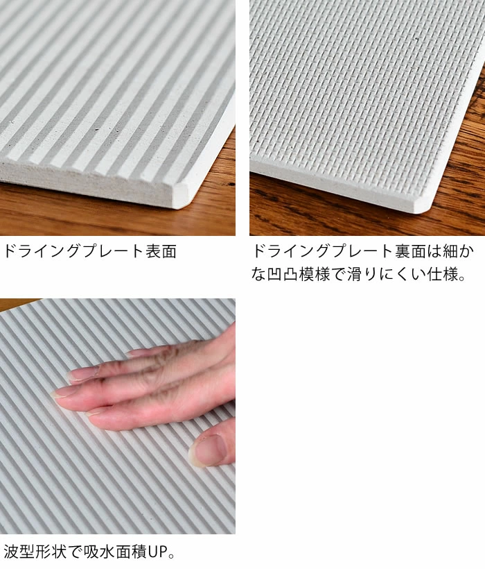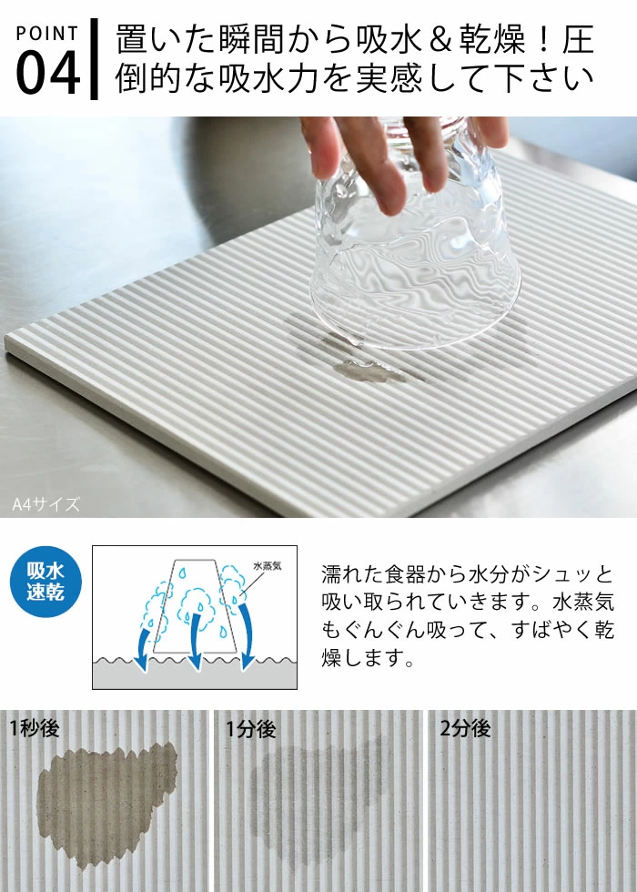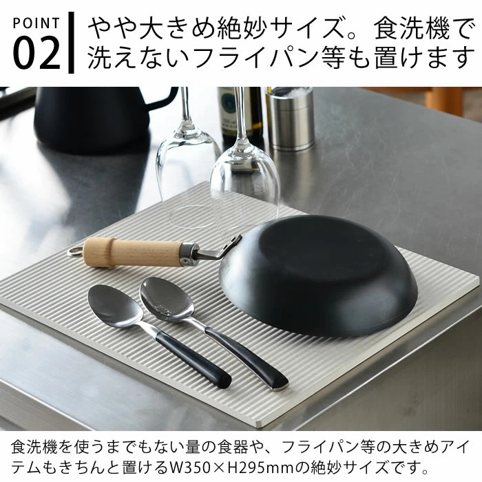 採用秋田產高品質硅藻土與消石灰製成,完全不含石綿,並由日本工廠製造加工,安全可靠。屬於寬版設計,能同時放置多件餐具或鍋具,特別適合食洗機無法處理的大型廚具。表面具微細孔結構,能瞬間吸收水滴並快速蒸發,保持乾爽清潔,並具備抗菌、防霉及除臭效果。設計簡約自然,能在廚房或餐桌上使用,保持整潔衛生,亦適合作為新居或禮品之選👍🏻