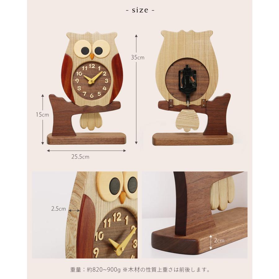 福郎木製座鐘以北海道天然木材手工製作,外形設計成福郎(貓頭鷹)造型,寓意「福來」與「不苦勞」,象徵幸福與安穩。鐘體採用無垢木材多樹種拼合而成,質感溫潤自然,搭配振子設計,尾羽會隨著鐘擺輕輕搖動,增添療癒氛圍。尺寸約360×260mm,重量約1kg,適合放置於客廳、書房或玄關,既是實用時計亦是工藝擺設。👍🏻