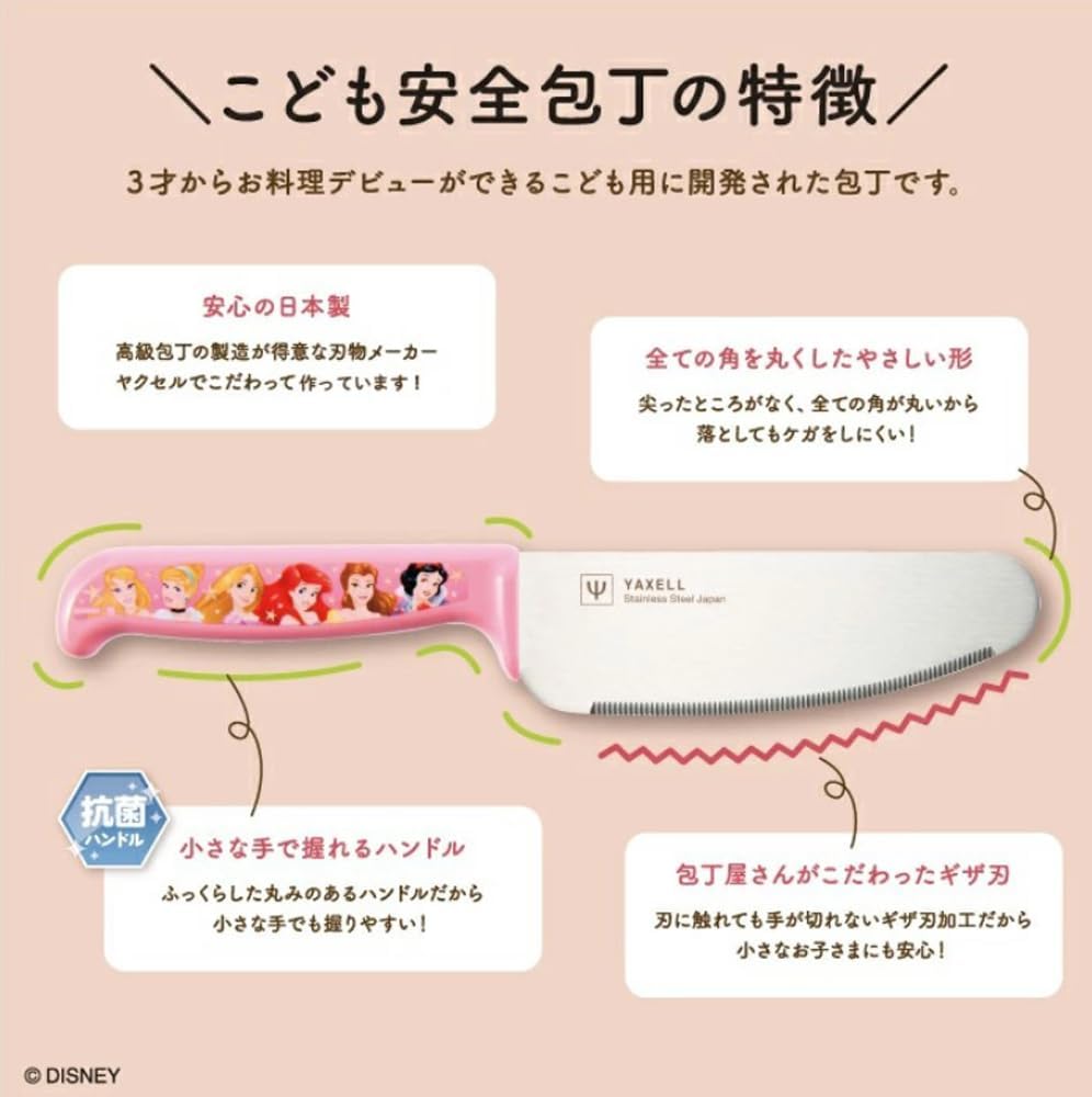 專為3歲以上小朋友設計,刀刃採用不鏽鋼刃物鋼製成,具備耐用性及基本切割力,刃口為鋸齒狀並配合圓形刀尖,能有效避免誤傷,適合切割番茄、香蕉等柔軟食材。刀柄以抗菌聚丙烯製造,握感輕巧,耐熱溫度可達80℃,安全衛生。全長約22cm,刃長約12cm,重量僅約60g,方便小朋友握持。產品可放入洗碗機清洗,設計以迪士尼角色為主題,讓小朋友在親子料理過程中更有興趣參與,培養食育及廚房安全意識👍🏻