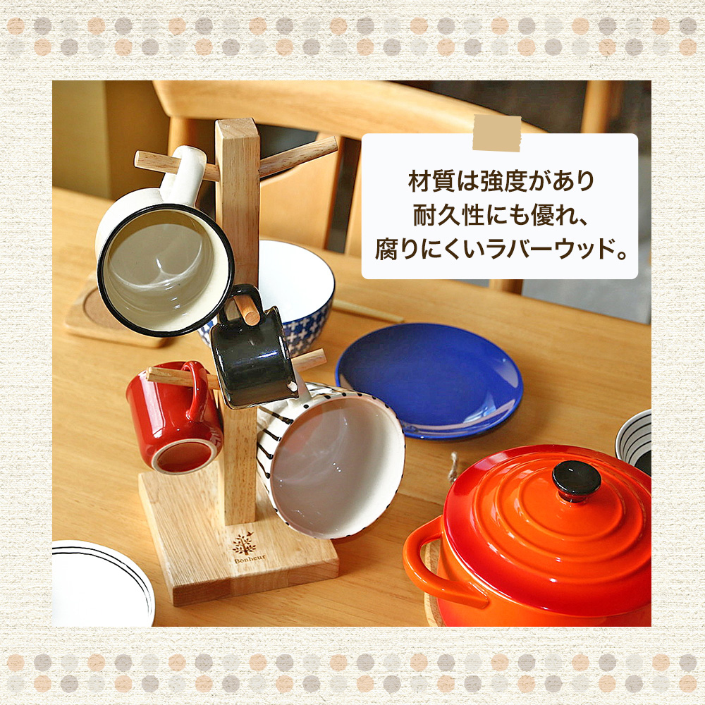🔥🔥【日本直送《BONHEUR》木杯架】 《BONHEUR》系列產品,《BONHEUR》法語為”幸褔”的意思,一款兼具實用性與裝飾性的木製杯架,適合擺放於廚房或餐桌旁,營造溫馨的咖啡角落。採用 橡膠木製成,表面經過清漆塗裝,展現自然溫潤的木紋。六支掛桿可懸掛馬克杯、茶杯或小物,讓收納也成為裝飾。底座為正方形設計,提升穩定性,不易傾倒👍🏻 材質:天然木 尺寸:寬度約120×深度約120×高度約330mm 重量:320g 產地:越南 🇯🇵日本直送約3-4星期 ___________________________________________ 💬 唔想錯過最新產品資訊及優惠歡迎加入我哋Whatsapp群組: https://chat.whatsapp.com/IJFfq1i7kMz46Zjc1NSXQF ___________________________________________