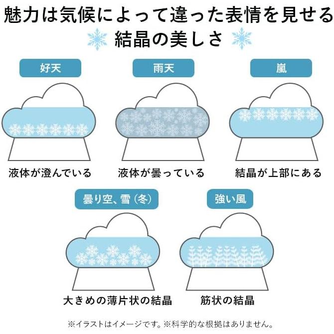 🔥🔥【日本直送《FUN SCIENCE》天氣預報小擺設】 一個採用19世紀初在歐洲廣泛被採用的一種天氣預報儀器,雖然未必能完全準確地預測到天氣狀況,但作為一小擺設亦都十分精緻,液體中的雪花晶體會隨著天氣和溫度的變化而發生獨特變化,不同形態表達不同天氣,看上去十分療癒👍🏻 材質:硼矽酸鹽玻璃、天然木材(海灘木)、混合物(水、乙醇、天然樟腦)等。 尺寸:高110 x 寬130 x 深50mm(含支架) 重量:355g 產地:中國 🇯🇵日本直送約3-4星期