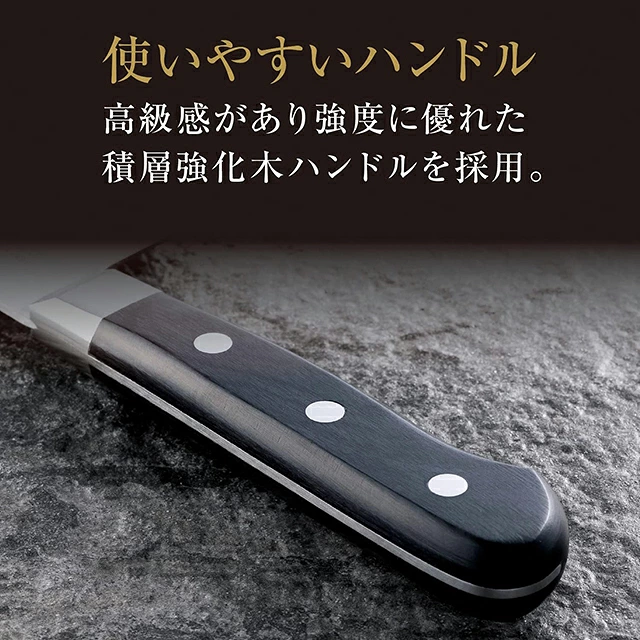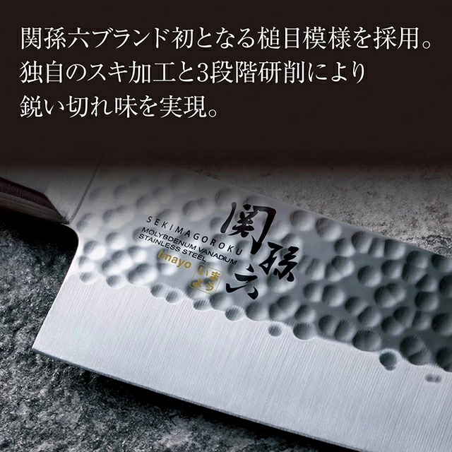 刀身採用莫利布登釩不鏽鋼,具備耐鏽性及易於保養的特點,表面帶有槌目紋理設計,能減少食材與刀面的接觸面積,降低切斷阻力,令切割更順暢。經過三工程刃付處理,刃口鋒利持久,切割食材時能保持爽快手感。手柄使用積層強化木,握感舒適且耐用,設計符合人體工學,長時間使用亦不易疲勞。此刀適合處理肉類、蔬菜及魚類,兼具家庭與專業用途,並且左右手皆可使用👍🏻